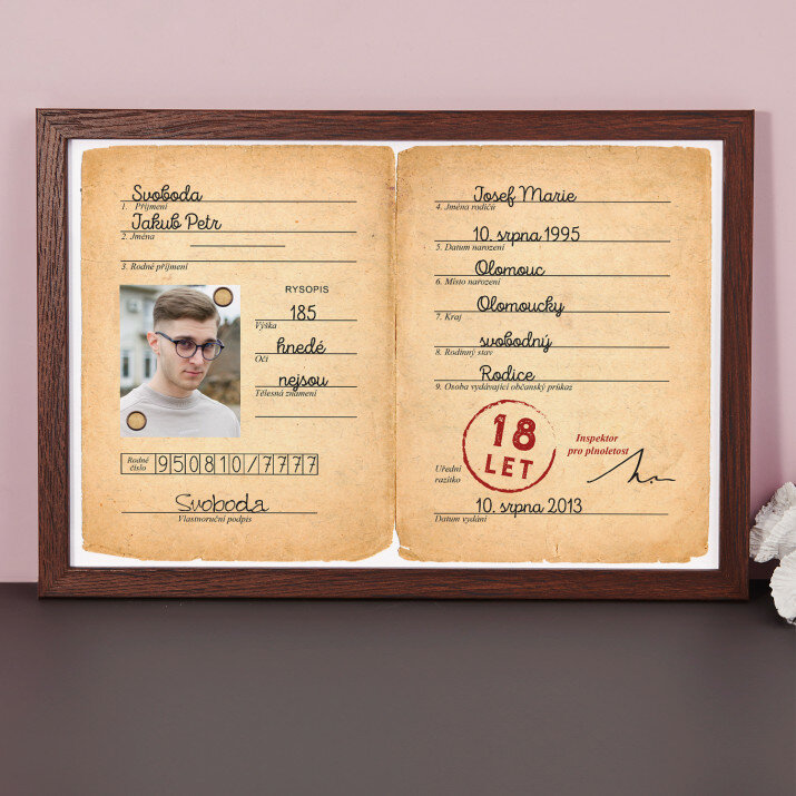 Zajímavý dárek k osmnáctinám! Tisk je velmi kvalitní, jednoduché personalizování a ten dřevěný rámeček - je skvělý! Doporučuji!