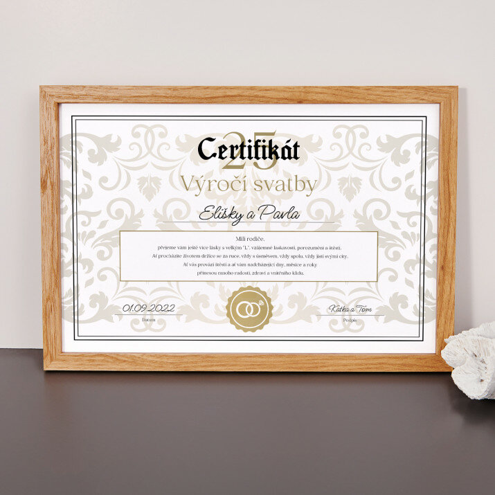 Jsem nadšený tímto certifikátem. Ideální dárek k výročí svatby rodičů. Personalizace je efektní a certifikát je elegantní.