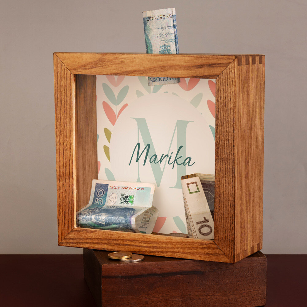 Jedinečná dřevěná pokladnička vyrobená z mořeného a lakovaného jasanového dřeva. Na přední straně je sklo, díky kterému budou úspory dobře viditelné! Díky své jednoduché a elegantní formě se hodí do každého interiéru. Pokladnička má odnímatelnou zadní část, což umožňuje její snadné otevření kdykoli. Personalizovaný potisk umožní ještě více přizpůsobit dárek obdarované osobě a příležitosti!
