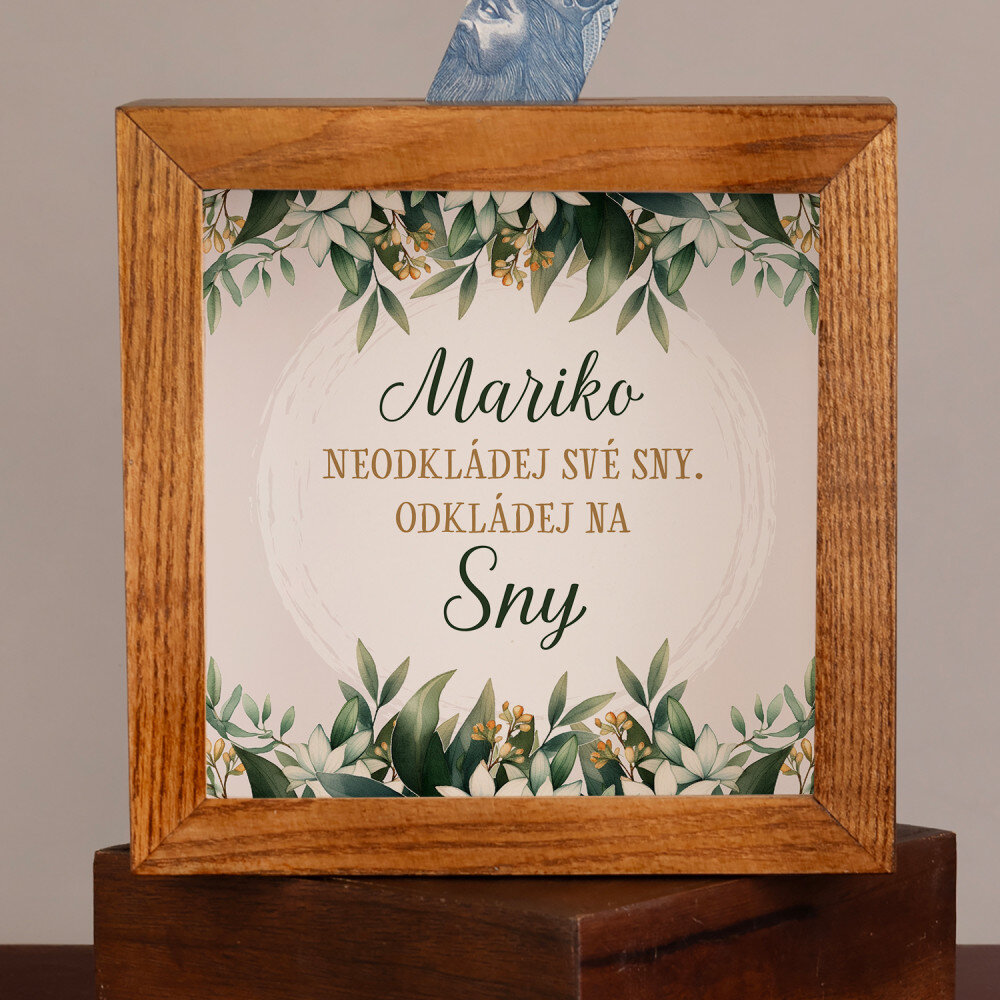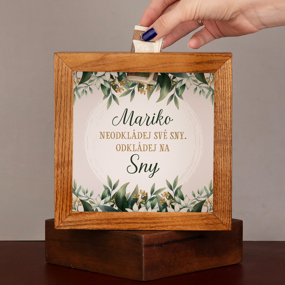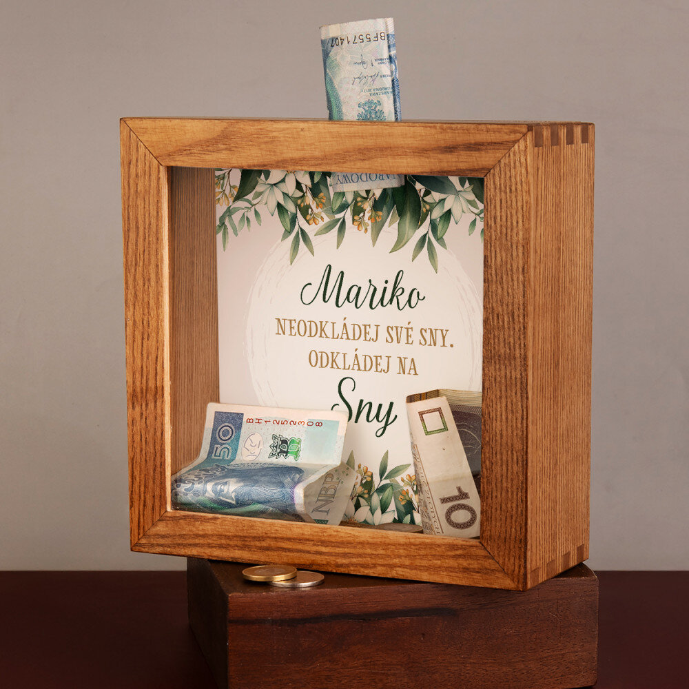 Jedinečná dřevěná pokladnička vyrobená z mořeného a lakovaného jasanového dřeva. Na přední straně je sklo, díky kterému budou úspory dobře viditelné! Díky své jednoduché a elegantní formě se hodí do každého interiéru. Pokladnička má odnímatelnou zadní část, což umožňuje její snadné otevření kdykoli. Personalizovaný potisk umožní ještě více přizpůsobit dárek obdarované osobě a příležitosti!