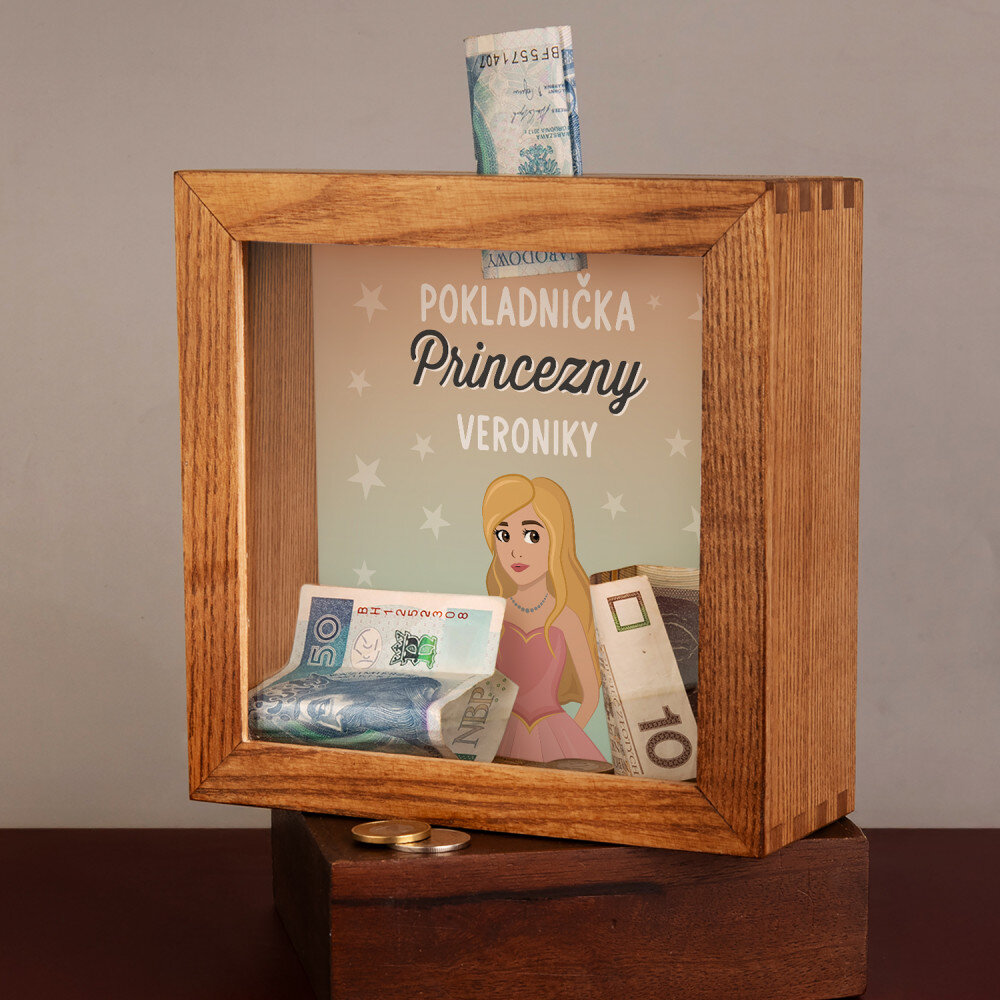 Jedinečná dřevěná pokladnička vyrobená z mořeného a lakovaného jasanového dřeva. Na přední straně je sklo, díky kterému budou úspory dobře viditelné! Díky své jednoduché a elegantní formě se hodí do každého interiéru. Pokladnička má odnímatelnou zadní část, což umožňuje její snadné otevření kdykoli. Personalizovaný potisk umožní ještě více přizpůsobit dárek obdarované osobě a příležitosti!