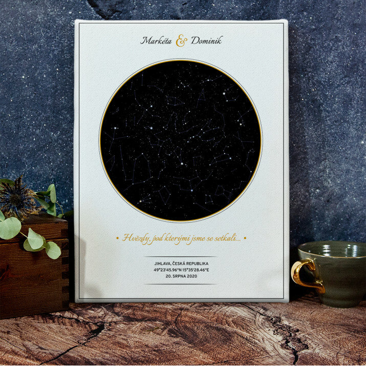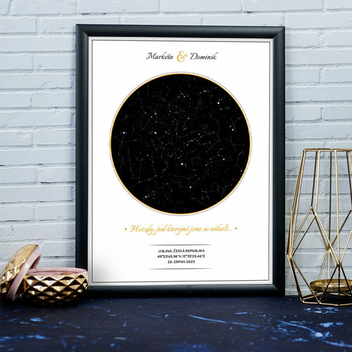 Jedinečný plakát v rámu nebo obraz na plátně bude krásnou a originální památkou na důležitý den ve vašem životě. Vyberte místo a datum, abychom mohli vytvořit mapu s hvězdami, které zářily toho dne. V personalizačním poli můžete také zadat jména, věnování a další údaje, díky kterým bude takový výtisk velmi osobním a jedinečným dárkem.VLASTNÍ MOTIV