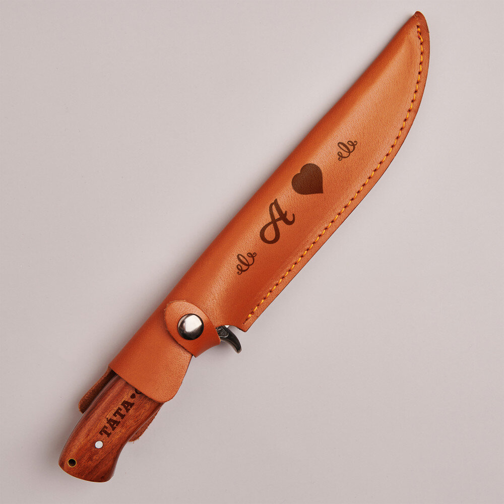 Lovecký jednočepelový nůž značky TASMAN. Má klasický, jednoduchý design a je pečlivě vyroben z vysoce kvalitního materiálu. Díky tomu nůž nikdy vás nezklame a bude fungovat za všech podmínek. Nůž má hnědou dřevěnou rukojeť a elegantní pouzdro z přírodní kůže. Personalizovaný vzor umístíme na rukojeť a pochvu.Specifikace: