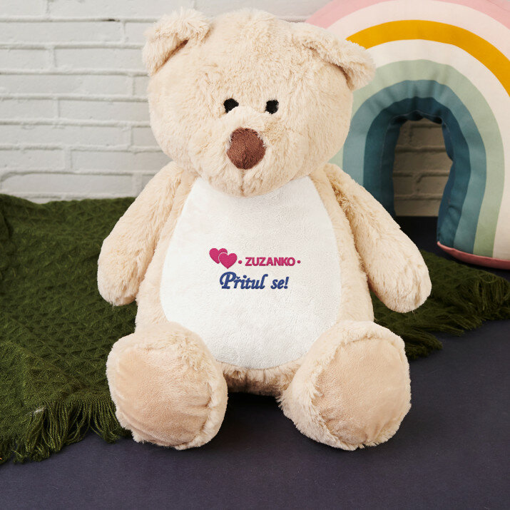 Velký a úžasně měkký plyšový medvídek, zdobený jedním z našich personalizovaných, vyšívaných vzorů. Složení: 100% polyester. Medvídek máunikátní zip, který umožňuje vyjmutí vnitřku a bezpečné čištění. Medvídek je bezpečný pro děti všech věkových kategorií. Ruční praní. Výška plyšáka: 45 cm.
