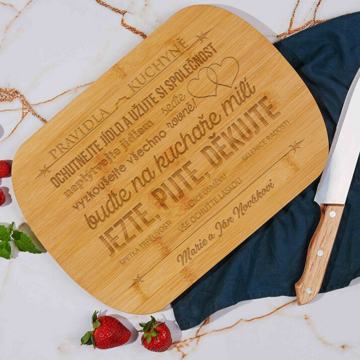Prkénko Altom Design z vysoce kvalitního bambusu bude nepostradatelným pomocníkem v kuchyni. Jejího praktické rozměry poskytují dostatečný prostor pro krájení, sekání a podávání různých pokrmů. Prkénko vyniká nejenom krasným vzhledem, ale je také extrémně trvalé a odolné proti poškrábání. Přiložený ostřič vám navíc umožní udržovat nože v perfektním stavu naostření, což se promítá do přesnosti při přípravě pokrmů. Na povrch prkénka umístíme Vámi vybraný personalizovaný vzor.Rozměry prkénka: cca 37,5 cm x 25,5 cm x 1,5 cm