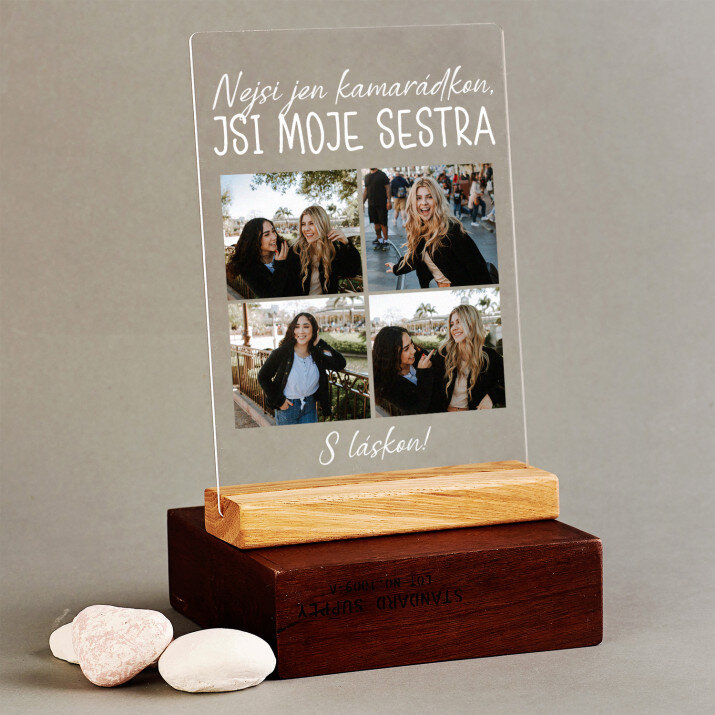 Tisk na akrylovém skle s dřevěným podstavcem.