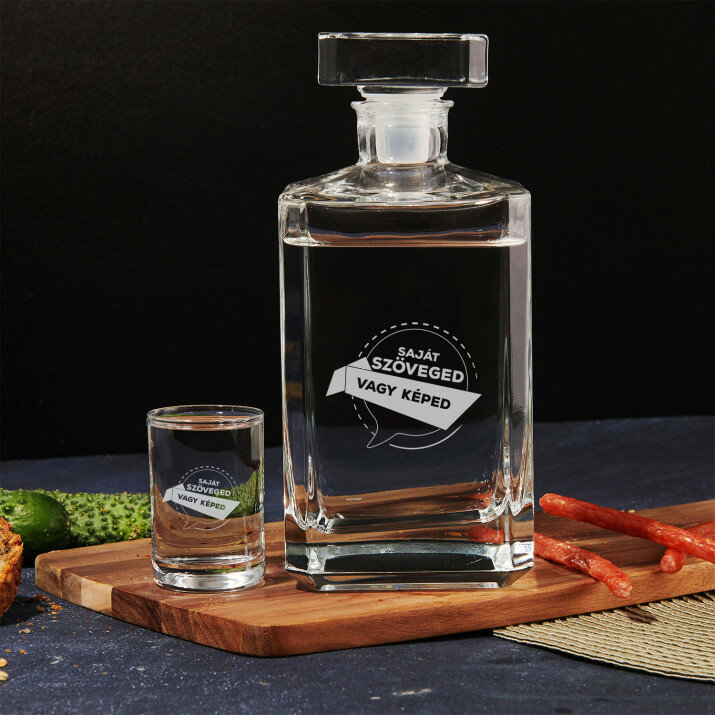 Sady s gravírovanou karafou a 6 skleničkami na vodkuKarafa je vyrobena z vysoce kvalitního průhledného skla. Díky jednoduchému tvaru a elegantnímu designu bude produkt vypadat skvěle nejen ve skleněné vitríně v obývacím pokoji, ale především na stole během oslav nebo setkání s přáteli. Čtvercový tvar karafy láme světlo, takže barva každého nápoje vypadá perfektně. Objem karafy je 700 ml, výška 19,5 cm a šířka 8,5 cm.