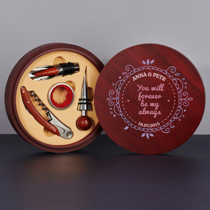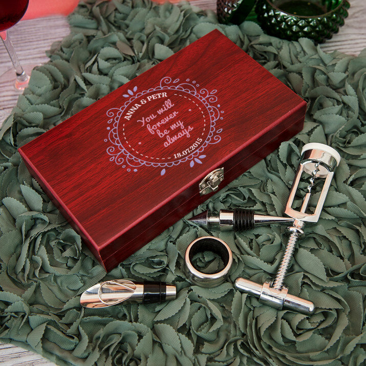 Krásná čtyřdílná sada na víno v elegantní dřevěné krabičce s gravírováním na víku.Na výběr jsou dvě verze: