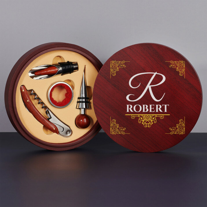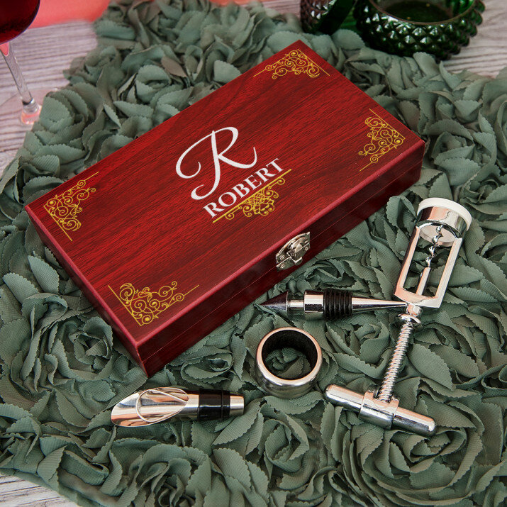 Krásná čtyřdílná sada na víno v elegantní dřevěné krabičce s gravírováním na víku.Na výběr jsou dvě verze: