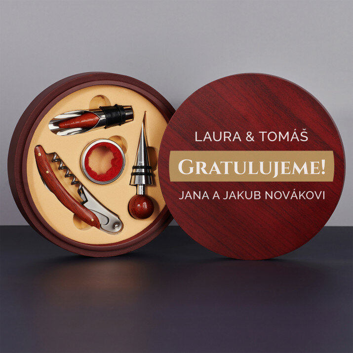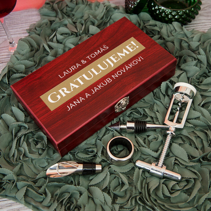 Krásná čtyřdílná sada na víno v elegantní dřevěné krabičce s gravírováním na víku.Na výběr jsou dvě verze: