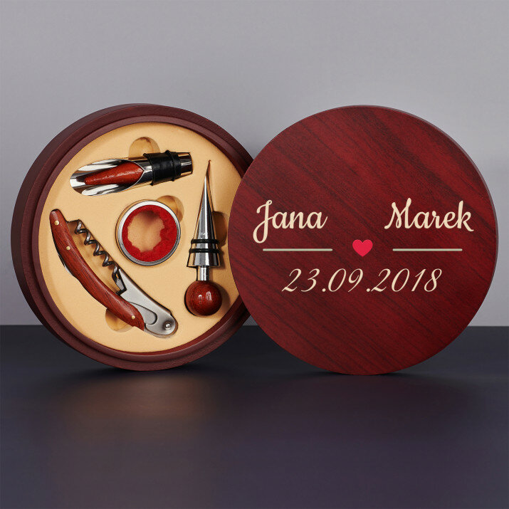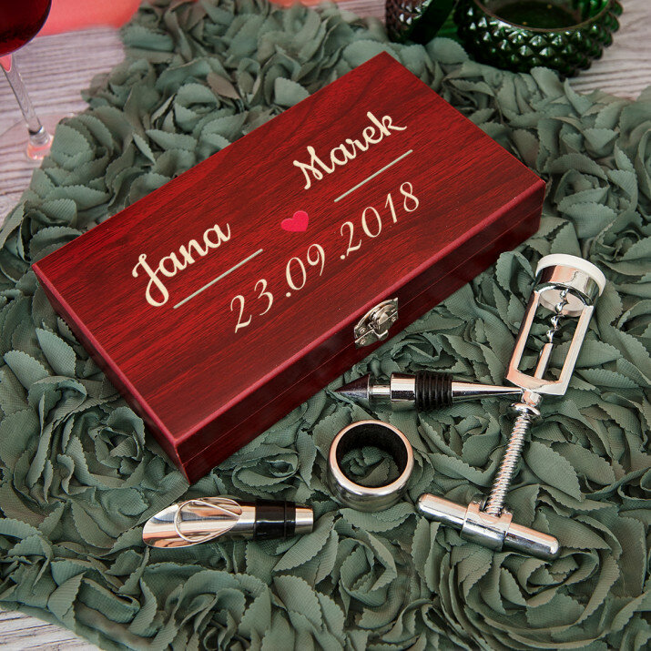 Krásná čtyřdílná sada na víno v elegantní dřevěné krabičce s gravírováním na víku.Na výběr jsou dvě verze: