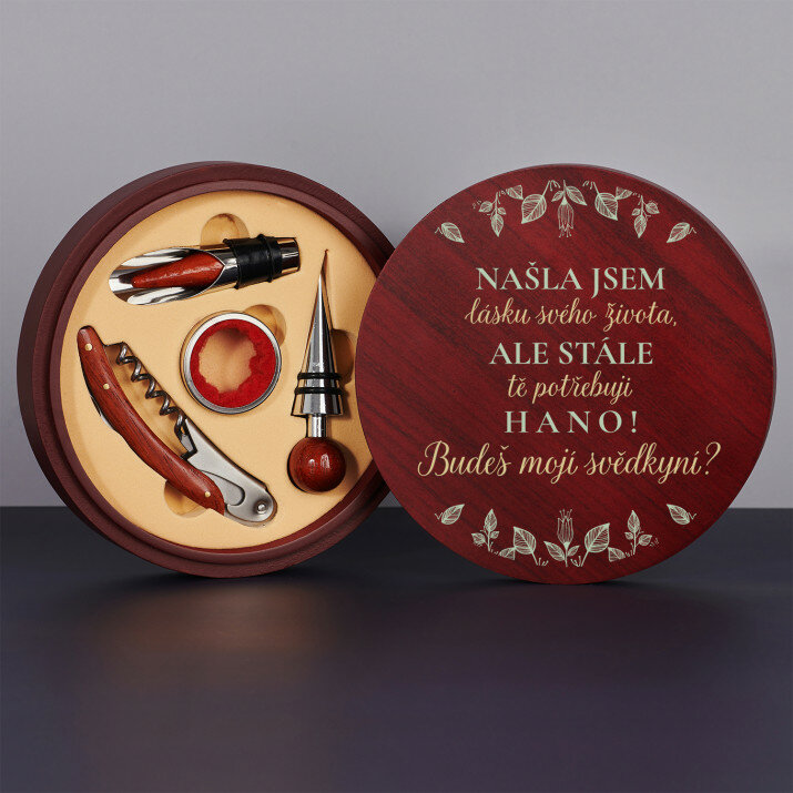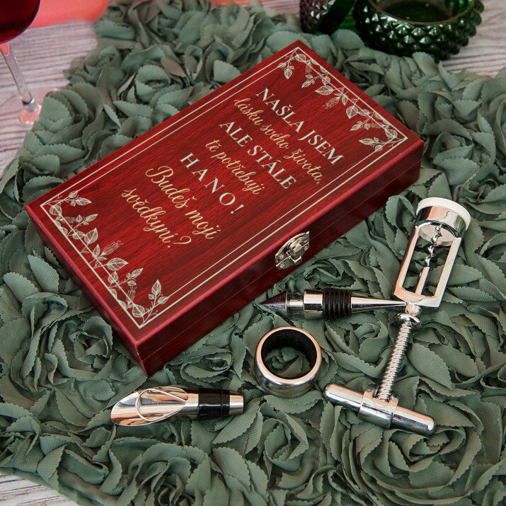 Krásná čtyřdílná sada na víno v elegantní dřevěné krabičce s gravírováním na víku.Na výběr jsou dvě verze: