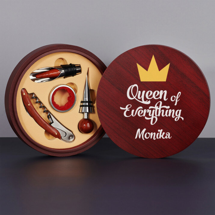 Krásná čtyřdílná sada na víno v elegantní dřevěné krabičce s gravírováním na víku.Na výběr jsou dvě verze: