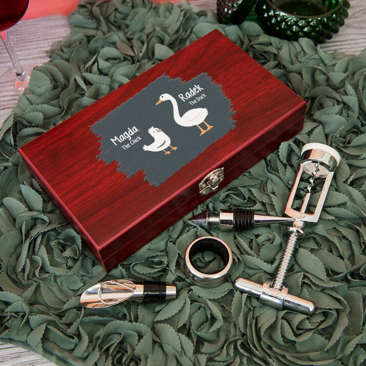 Krásná čtyřdílná sada na víno v elegantní dřevěné krabičce s gravírováním na víku.Na výběr jsou dvě verze: