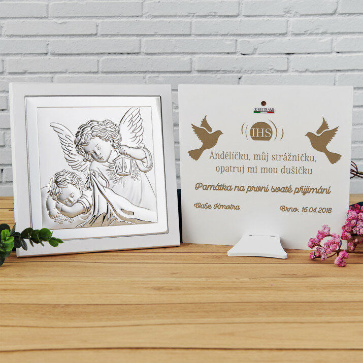 Tento stříbrný obrazek s andělkem a lucernou je roztomilá dekorace. Ideální jako dárek na křest nebo první svaté přijímání.