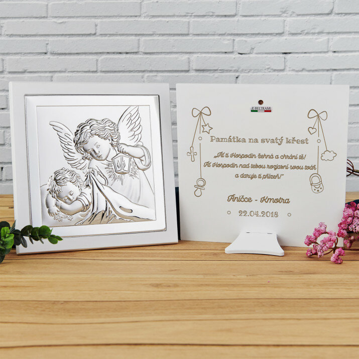 Obrázek o rozměrech 16 x 16 cm vytvořený metodou laminace stříbrem. Vnější vrstva stříbra byla zabezpečena speciálním ochranným lakem. Zadní strana obrázku je vyrobena z kvalitního dřeva. Obrázek je vhodný k zavěšení nebo postavení díky přiložené nožce. Výrobcem je renomovaná italská společnost. Obraz je dodáván s certifikátem pravosti a je zabalen v originální firemní krabici.