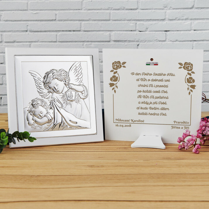 Obrázek o rozměrech 16 x 16 cm vytvořený metodou laminace stříbrem. Vnější vrstva stříbra byla zabezpečena speciálním ochranným lakem. Zadní strana obrázku je vyrobena z kvalitního dřeva. Obrázek je vhodný k zavěšení nebo postavení díky přiložené nožce. Výrobcem je renomovaná italská společnost. Obraz je dodáván s certifikátem pravosti a je zabalen v originální firemní krabici.