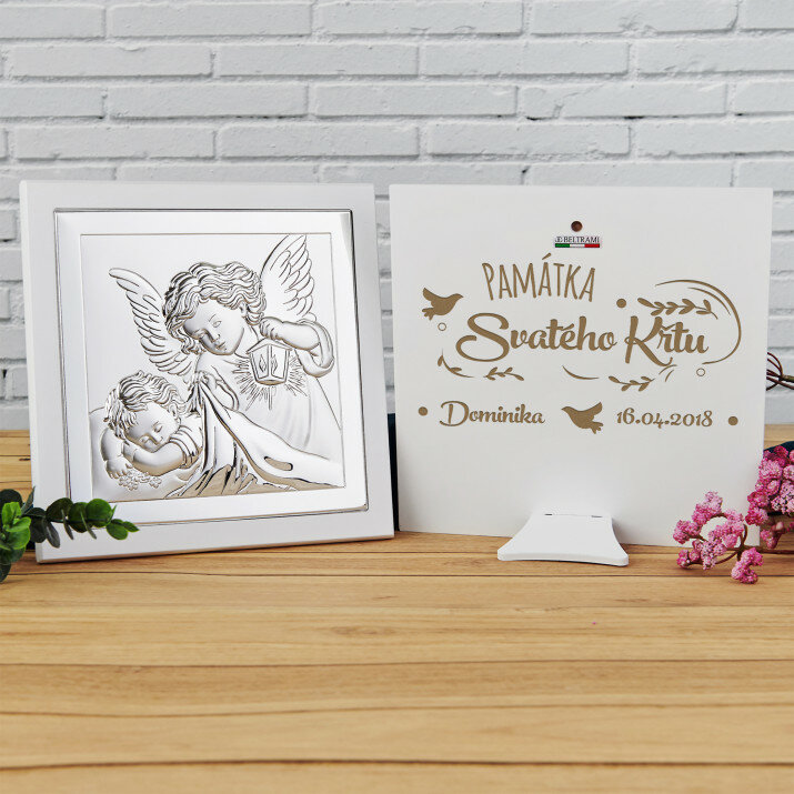 Obrázek o rozměrech 16 x 16 cm vytvořený metodou laminace stříbrem. Vnější vrstva stříbra byla zabezpečena speciálním ochranným lakem. Zadní strana obrázku je vyrobena z kvalitního dřeva. Obrázek je vhodný k zavěšení nebo postavení díky přiložené nožce. Výrobcem je renomovaná italská společnost. Obraz je dodáván s certifikátem pravosti a je zabalen v originální firemní krabici.