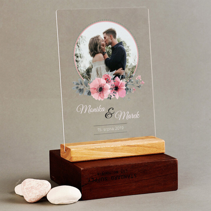 Výjimečná památka, která potěší obdarovaného! Tisk na čirém akrylovém skle (plexisklo) tloušťky 2 mm je dárek, který bude dělat radost dlouhá léta. Produkt je vyroben z vysoce kvalitních materiálů a je odolný proti poškození nebo povětrnostním vlivům. Díky elegantnímu dřevěnému stojanu můžete umístit tisk na polici. Takový barevný dárek s unikátním gravírováním bude samozřejmě skvělým překvapením!Nabízíme různé varianty tohoto tisku: