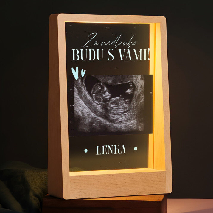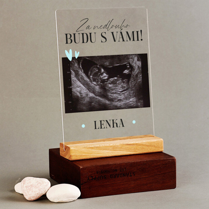 Tisk na akrylovém skle s dřevěným podstavcem.