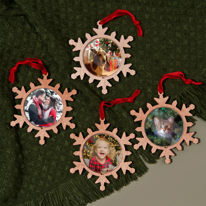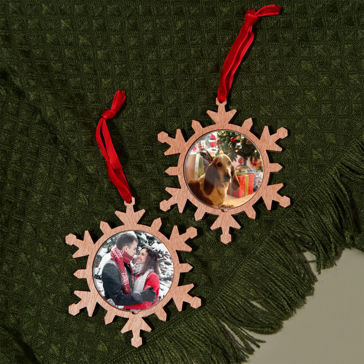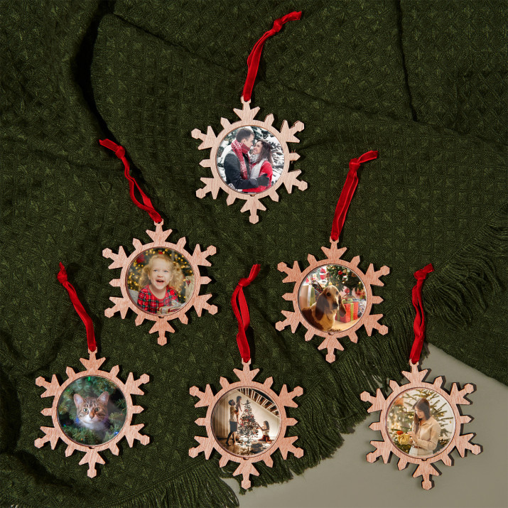 Pociťte kouzlo Vánoc a pověste si jedinečnou fotografii na vánoční stromeček! Ozdoba ve tvaru sněhové vločky je originální nápad na dekoraci vánočního stromečku. Vločka bude vypadat krásně mezi klasickými baňkami a barevnými řetězy. Překvapte blízkou osobu a darujte jí takovou dřevěnou ozdobu k příležitosti první společné oslavy Vánoc. Ozdobu můžete objednat ve čtyřech variantách: 1, 2, 4 nebo 6 kusů.Podrobné informace: