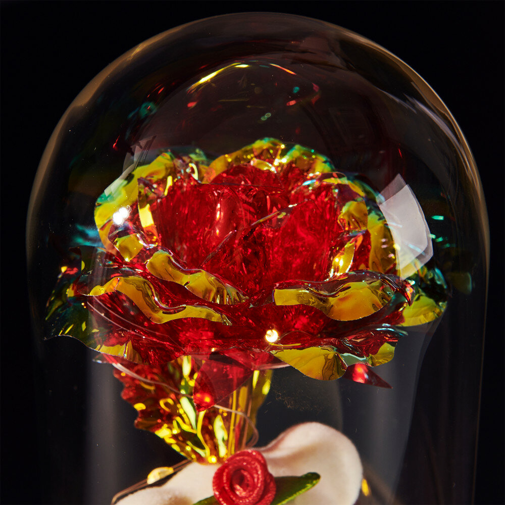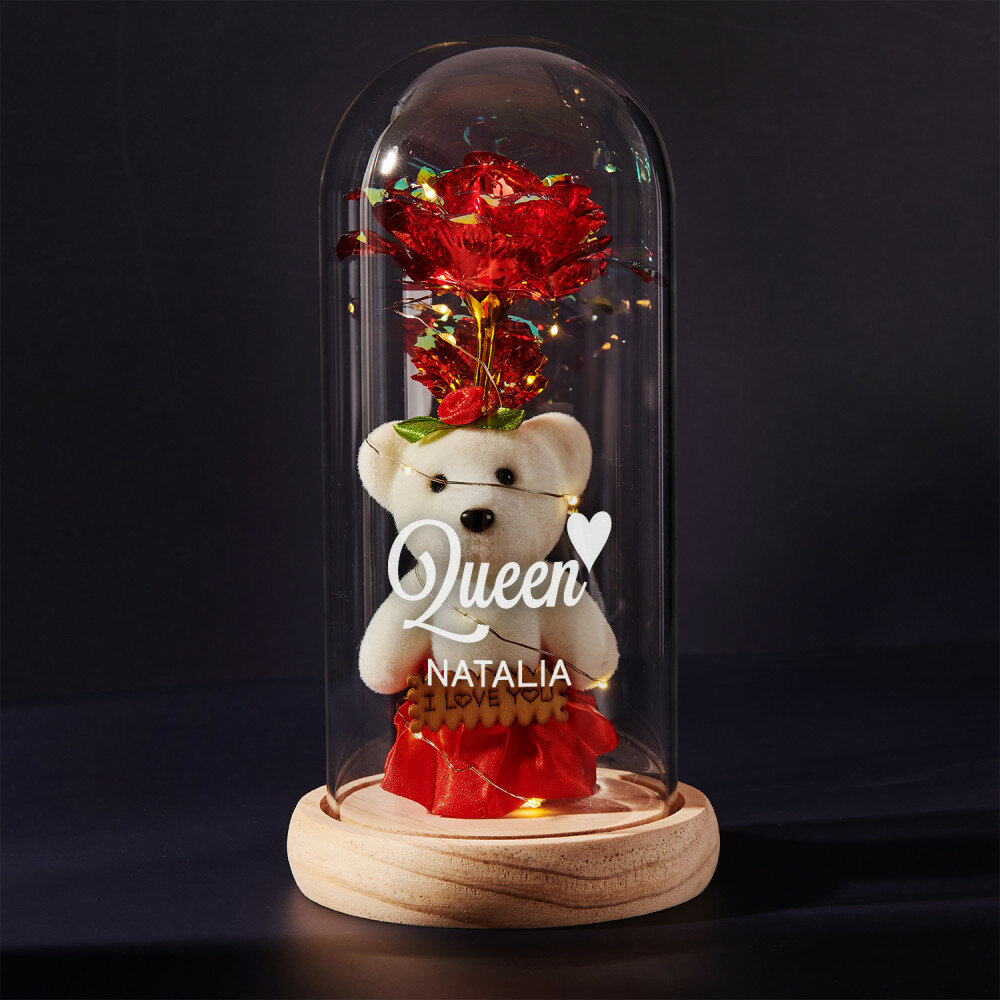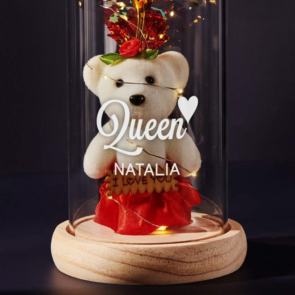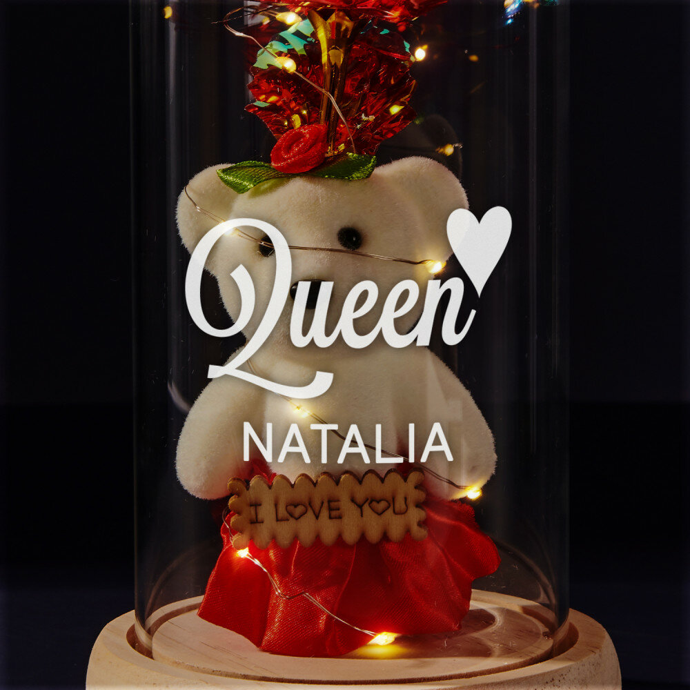 Věčná růže s plyšákem pod skleněnou kopulí je jedinečný dárek, který lze věnovat k mnoha příležitostem. Je to krásný a trvalý dárek, který se stane dokonalou památkou na dlouhá léta! Solidní průhledná kopulechrání jemnou růži a roztomilého medvídka a dodává dárku elegantní vzhled. Stojan je vyroben z vysoce kvalitního plastu a zaručuje stabilitu a trvalost celé kompozice. Světla LED umístěná uvnitř růže vytvářejí romantickou atmosféru. Na povrch skleněné kopule můžete přidat gravírované iniciály, jméno nebo krátký text, aby byl tento dárek ještě výjimečnější. Věčná růže je dodávána v elegantní dárkové krabičce.