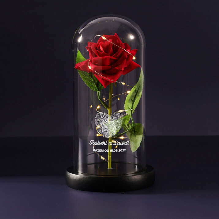 Krystalová věčná růže pod skleněnou kopulí je jedinečný dárek, který lze věnovat k mnoha příležitostem. Je to krásný a trvalý dárek, který se stane dokonalou památkou na dlouhá léta! Hlavní vlastnosti tohoto výrobku jsou jeho pevná, průhledná kopule, která chrání delikátní růži a dává jí elegantní vzhled. Stojan je vyroben z vysoce kvalitního plastustabilitu a trvalost celé kompozice.Kromě toho LED světla umístěné uvnitř růže vytvářejí romantickou atmosféru. Na povrchu skleněné kopule můžete přidat gravírované iniciály, jméno nebo krátký vzkaz, aby byl tento dárek ještě výjimečnější. Věčná růže je dodávána v dárkové krabičce.