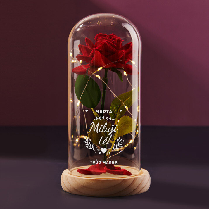 Krystalová věčná růže pod skleněnou kopulí je jedinečný dárek, který lze věnovat k mnoha příležitostem. Je to krásný a trvalý dárek, který se stane dokonalou památkou na dlouhá léta! Hlavní vlastnosti tohoto výrobku jsou jeho pevná, průhledná kopule, která chrání delikátní růži a dává jí elegantní vzhled. Stojan je vyroben z vysoce kvalitního plastustabilitu a trvalost celé kompozice.Kromě toho LED světla umístěné uvnitř růže vytvářejí romantickou atmosféru. Na povrchu skleněné kopule můžete přidat gravírované iniciály, jméno nebo krátký vzkaz, aby byl tento dárek ještě výjimečnější. Věčná růže je dodávána v dárkové krabičce.