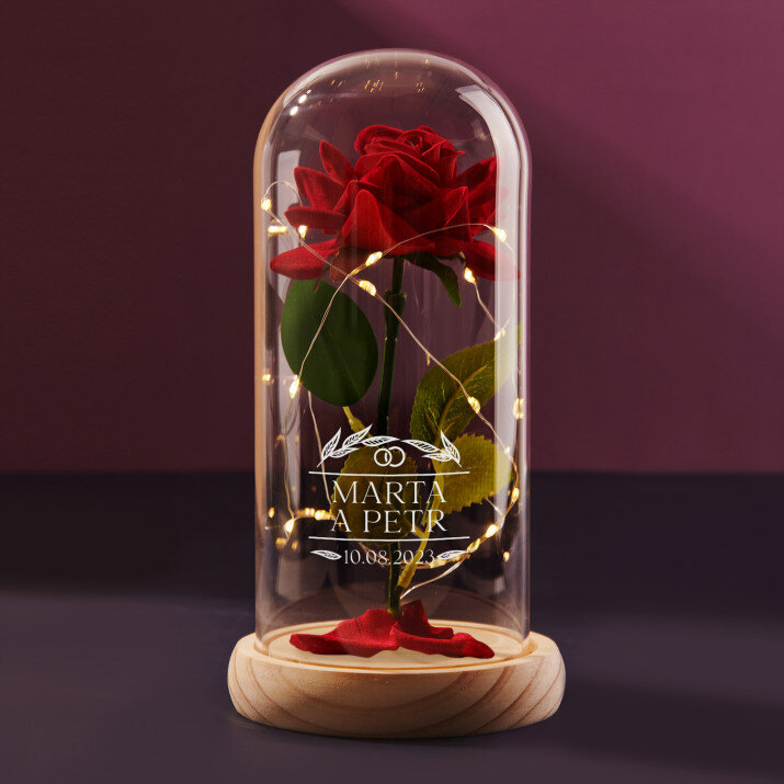 Krystalová věčná růže pod skleněnou kopulí je jedinečný dárek, který lze věnovat k mnoha příležitostem. Je to krásný a trvalý dárek, který se stane dokonalou památkou na dlouhá léta! Hlavní vlastnosti tohoto výrobku jsou jeho pevná, průhledná kopule, která chrání delikátní růži a dává jí elegantní vzhled. Stojan je vyroben z vysoce kvalitního plastustabilitu a trvalost celé kompozice.Kromě toho LED světla umístěné uvnitř růže vytvářejí romantickou atmosféru. Na povrchu skleněné kopule můžete přidat gravírované iniciály, jméno nebo krátký vzkaz, aby byl tento dárek ještě výjimečnější. Věčná růže je dodávána v dárkové krabičce.