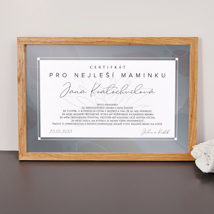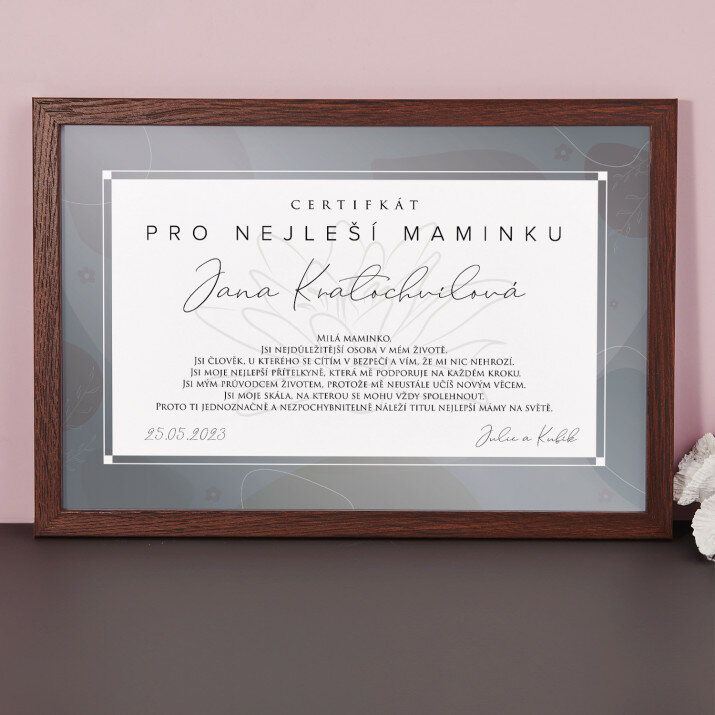 Certifikát 'Nejlepší maminka' je skvělým dárkem. Text je dojemný a možnost personalizace mu dodává ještě větší hodnotu.