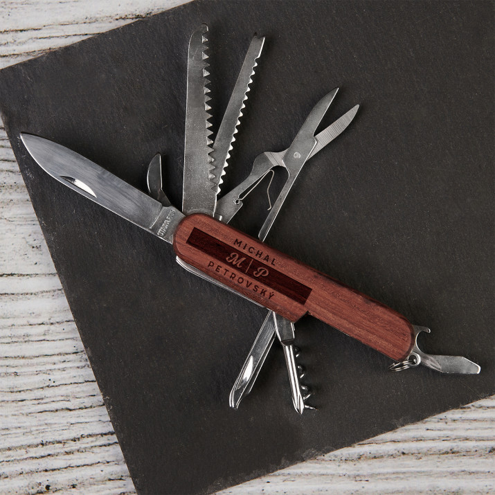 Kovový kapesní nůž s dřevěnou rukojetí zdobený gravírováním dle vašeho výběru. Celé to vypadá velmi elegantně, takže je to skvělý dárek pro každého kutila a nejen! Rozměry skládaného kapesního nože: 90 x 20 x 25 mm. Výrobek je zabalen v bílé kartonové krabici.Všechny funkce nástroje: