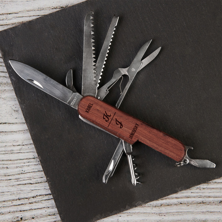 Kovový kapesní nůž s dřevěnou rukojetí zdobený gravírováním dle vašeho výběru. Celé to vypadá velmi elegantně, takže je to skvělý dárek pro každého kutila a nejen! Rozměry skládaného kapesního nože: 90 x 20 x 25 mm. Výrobek je zabalen v bílé kartonové krabici.Všechny funkce nástroje:
