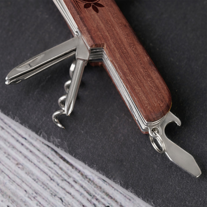 Kovový kapesní nůž s dřevěnou rukojetí zdobený gravírováním dle vašeho výběru. Celé to vypadá velmi elegantně, takže je to skvělý dárek pro každého kutila a nejen! Rozměry skládaného kapesního nože: 90 x 20 x 25 mm. Výrobek je zabalen v bílé kartonové krabici.Všechny funkce nástroje: