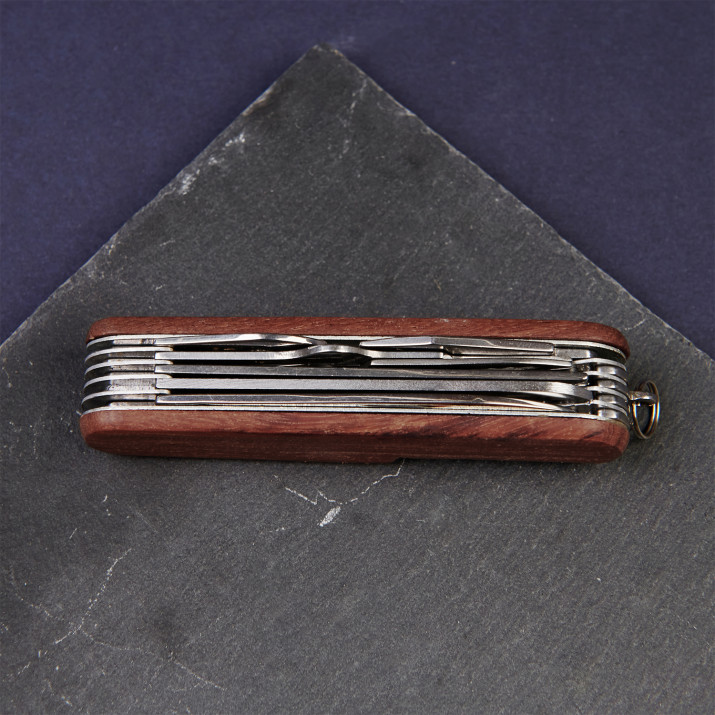 Kovový kapesní nůž s dřevěnou rukojetí zdobený gravírováním dle vašeho výběru. Celé to vypadá velmi elegantně, takže je to skvělý dárek pro každého kutila a nejen! Rozměry skládaného kapesního nože: 90 x 20 x 25 mm. Výrobek je zabalen v bílé kartonové krabici.Všechny funkce nástroje: