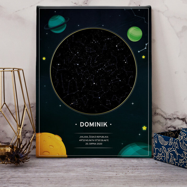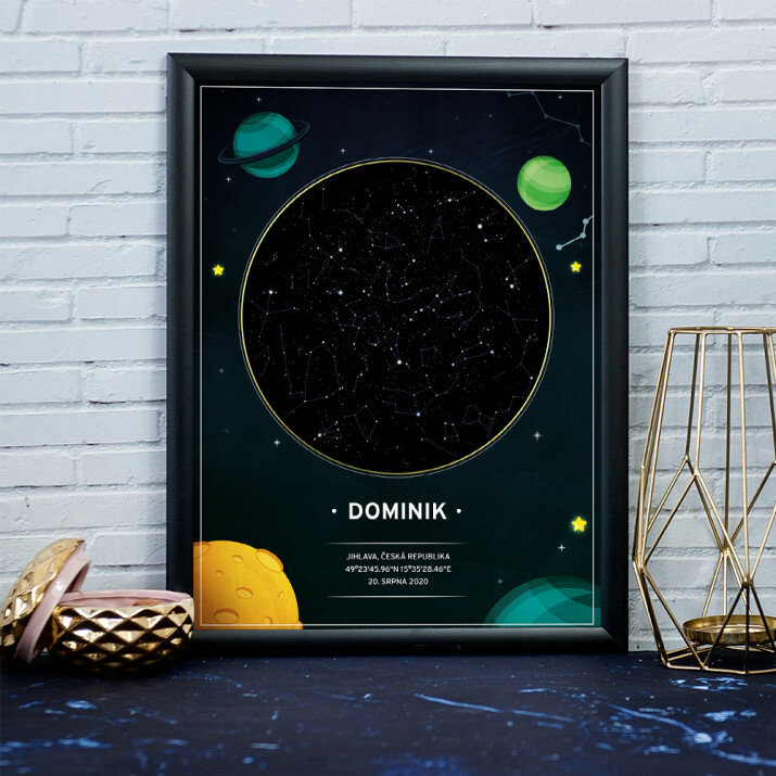 Jedinečný plakát v rámu nebo obraz na plátně bude krásnou a originální památkou na důležitý den ve vašem životě. Vyberte místo a datum, abychom mohli vytvořit mapu s hvězdami, které zářily toho dne. V personalizačním poli můžete také zadat jména, věnování a další údaje, díky kterým bude takový výtisk velmi osobním a jedinečným dárkem.VLASTNÍ MOTIV