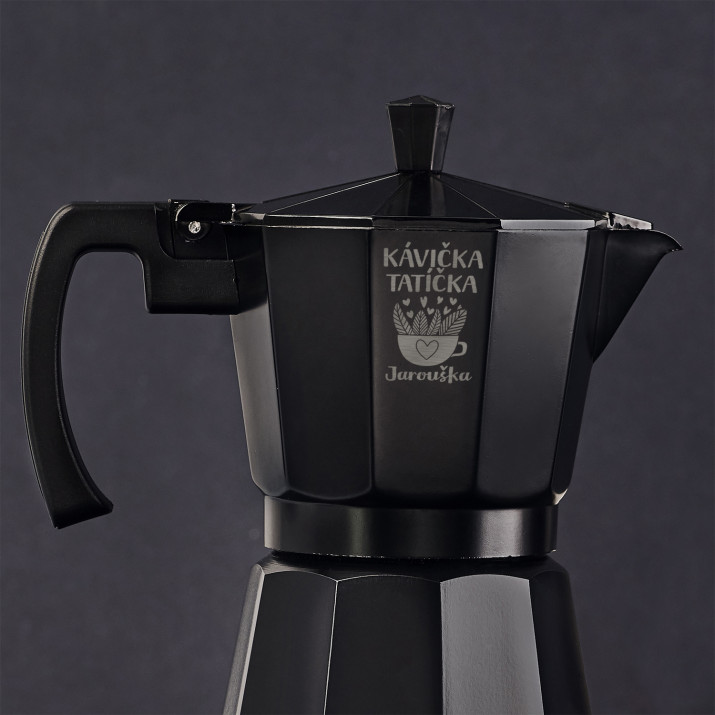 Černá moka konvice vyrobena z hliníku je dokonalým doplňkem kuchyně a bude skvělým dárkem pro všechny milovníky kávy. Vysoce kvalitní materiály a pevná konstrukce zajišťují pohodlné používání po dlouhou dobu a personalizované gravírování na černém povrchu dodává produktu jedinečný charakter.