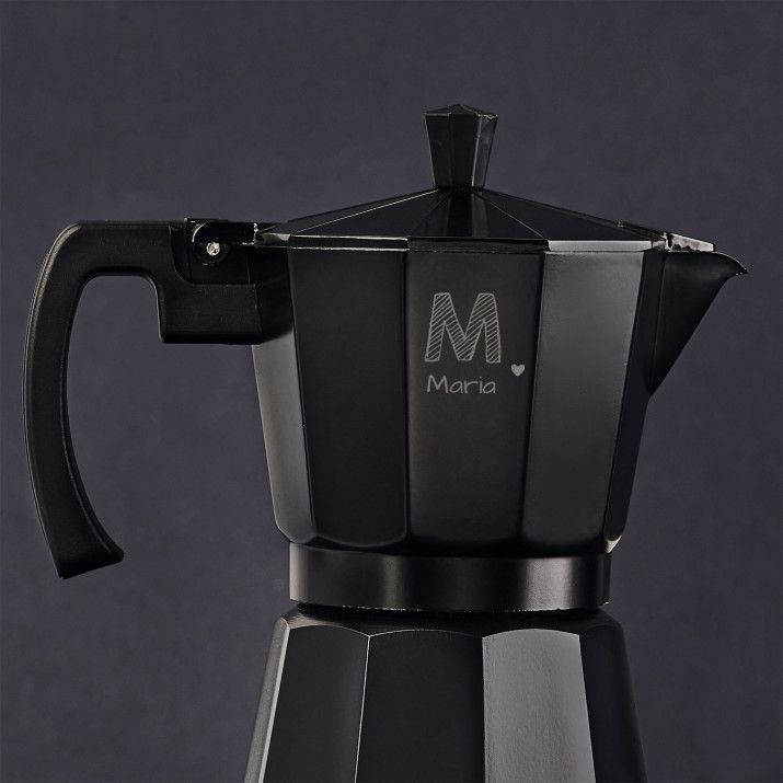 Černá moka konvice vyrobena z hliníku je dokonalým doplňkem kuchyně a bude skvělým dárkem pro všechny milovníky kávy. Vysoce kvalitní materiály a pevná konstrukce zajišťují pohodlné používání po dlouhou dobu a personalizované gravírování na černém povrchu dodává produktu jedinečný charakter.Díky konvičce velmi snadno připravíte lahodnou kávu! Spodní část je nádoba na vodu, v horní části se při vaření shromažďuje hotová káva. Mezi nimi je sítko na mletou kávu a gumové těsnění. Káva vzniká v důsledku tlaku generovaného ve spodní nádobě během vaření.