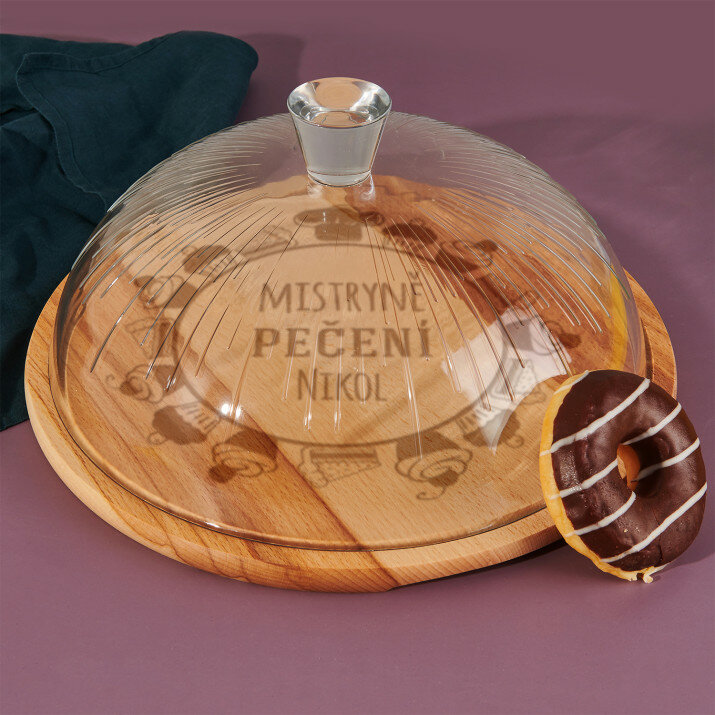 Kulaté prkénko je vyrobeno z bukového dřeva, díky čemuž vypadá elegantně a hodí se do každé kuchyně. Velmi kvalitní skleněný poklop s držadlem dodává výrobku noblesu. Prkénko je velmi praktickým a elegantním doplňkem kuchyně. Deska se vyznačuje pevným zpracováním, je odolná proti poškození a zdobí ji personalizované gravírování. Tento univerzální výrobek je ideální pro skladování a servírování nejrůznějších pochoutek, jako ovoce nebo zákusky.Rozměry: