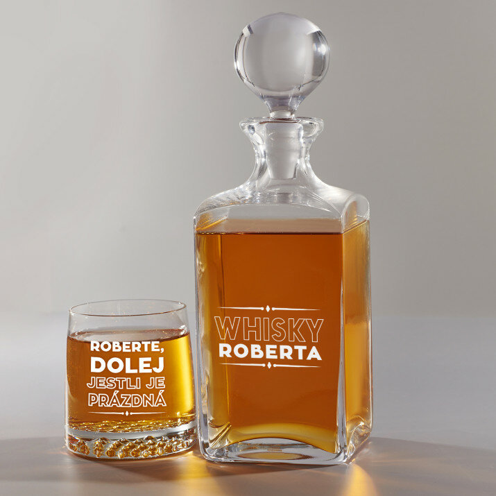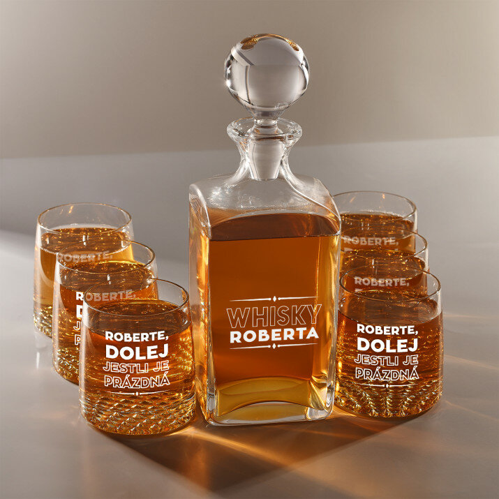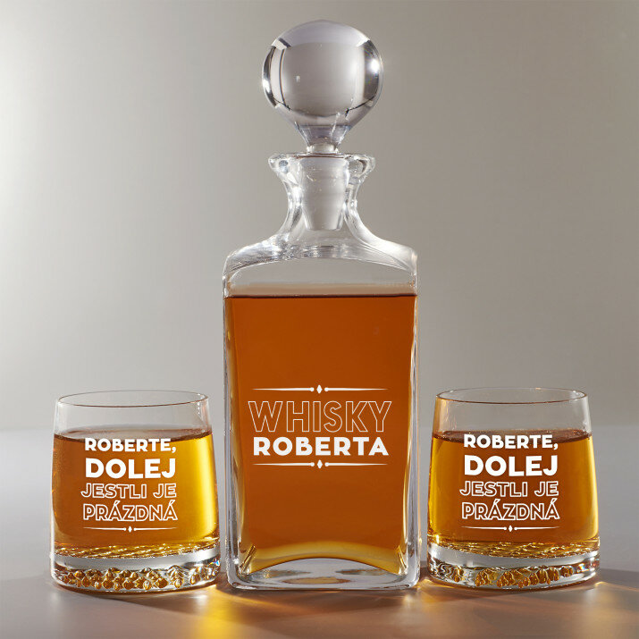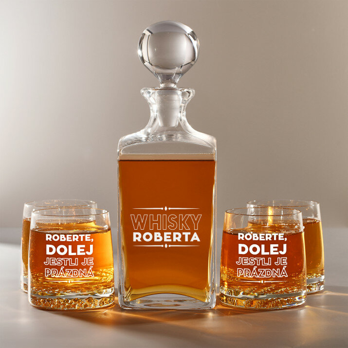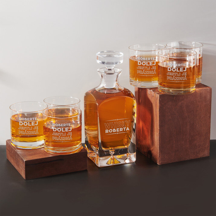Gravírovanou sadu s karafou a sklenicemi nabízíme ve čtyřech variantách::Karafa + 1 sklenice