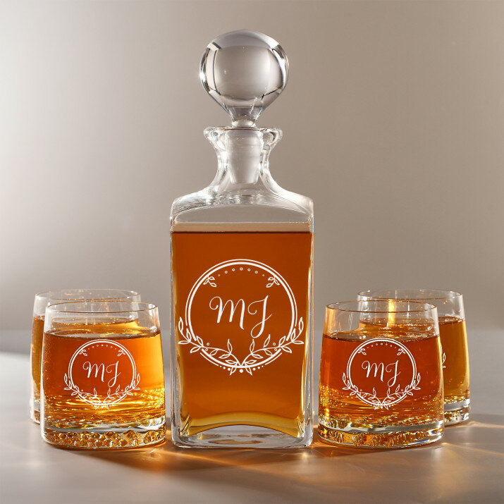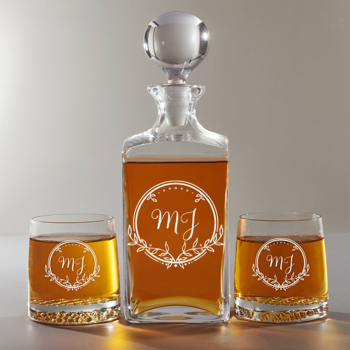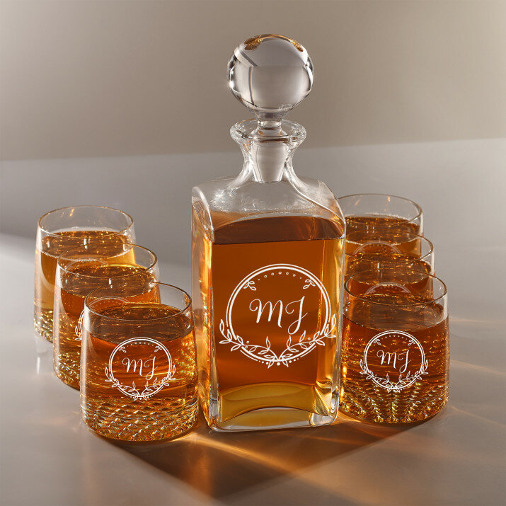 Gravírovanou sadu s karafou a sklenicemi nabízíme ve čtyřech variantách::Karafa + 1 sklenice