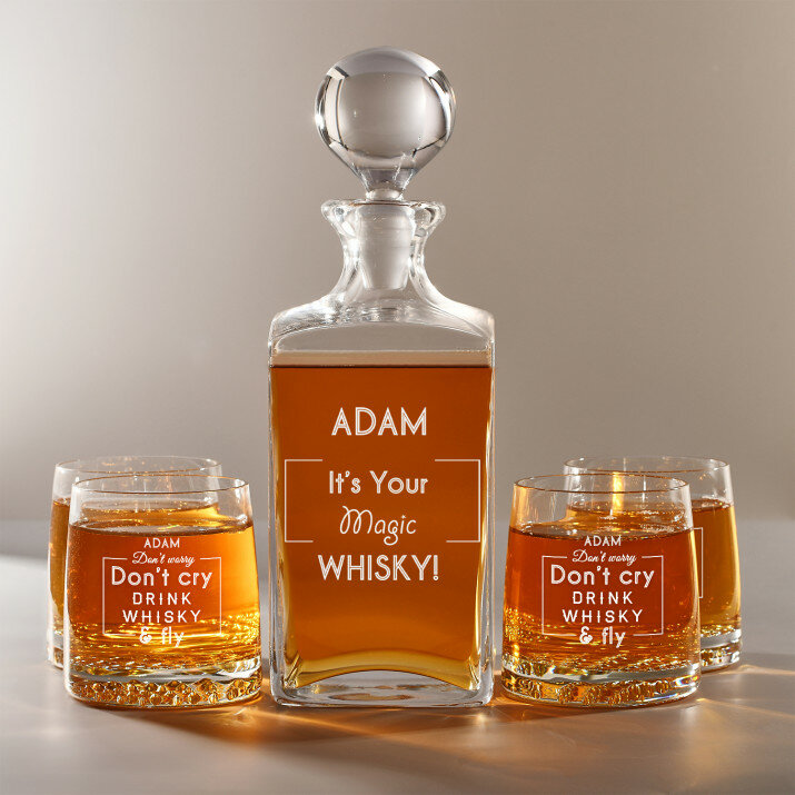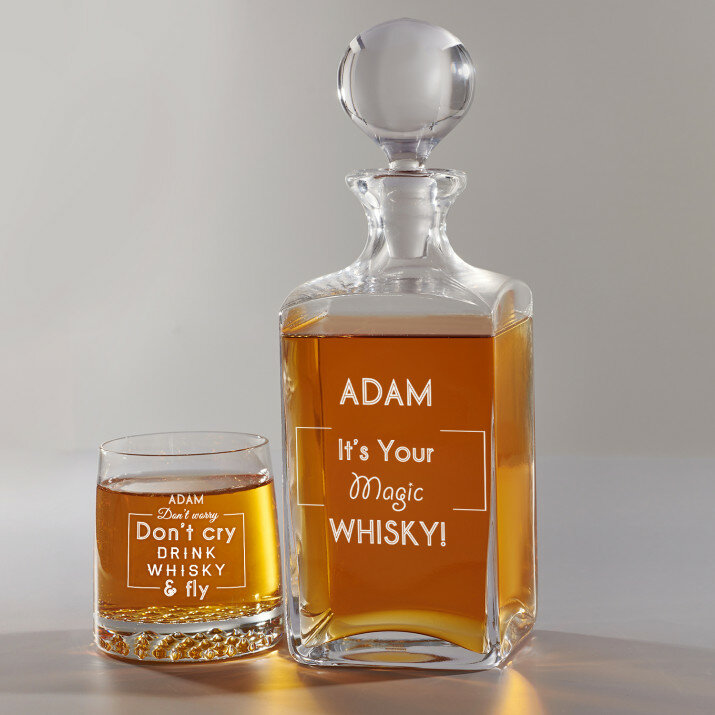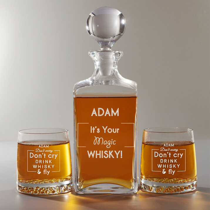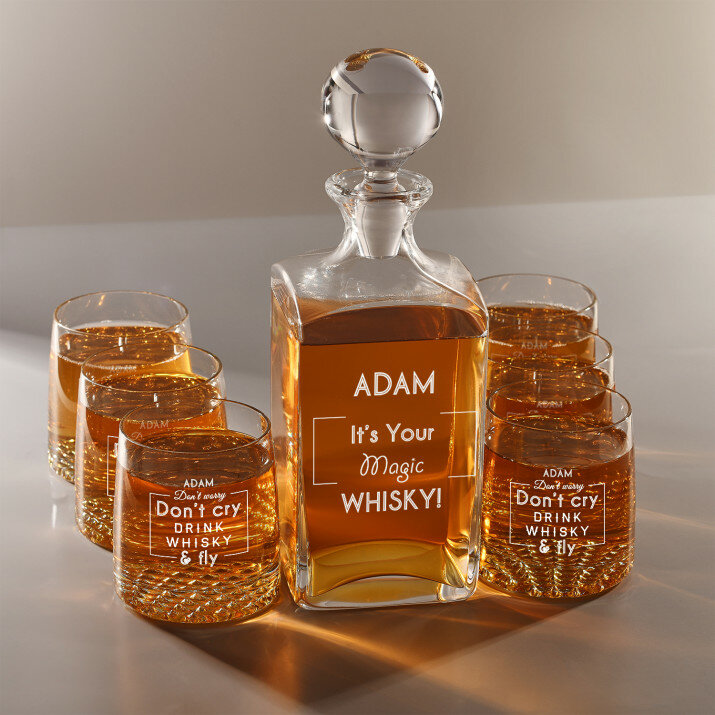 Gravírovanou sadu s karafou a sklenicemi nabízíme ve čtyřech variantách::Karafa + 1 sklenice