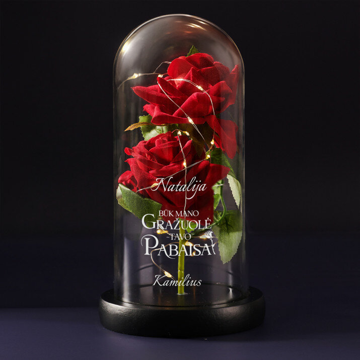 Kromě toho LED světla umístěné uvnitř růže vytvářejí romantickou atmosféru. Na povrchu skleněné kopule můžete přidat gravírované iniciály, jméno nebo krátký vzkaz, aby byl tento dárek ještě výjimečnější. Věčná růže je dodávána v dárkové krabičce.