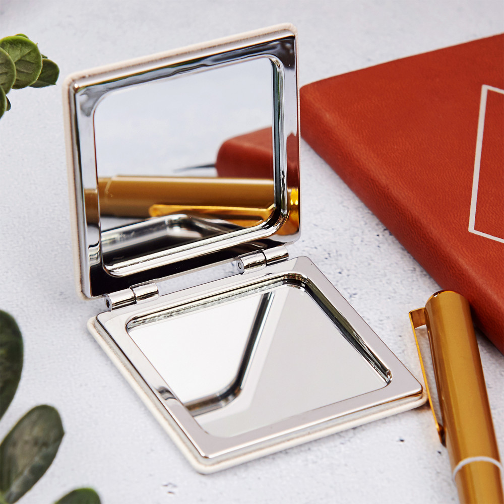 Nerozbitné zrcátko do kabelky je vyrobeno z leštěného kovu. Je bezpečně ukryté v obalu s ekologické kůže v bílé barvě. Kapesní zrcátko je dvoustranné. Má klasickou a zvětšovací stranu pro pohodlné používání. Elegantní a nadčasový desing se bude hodit každému. Zrcátko je povinnou výbavou každé dámské kabelky.Rozměry: 5,8 x 6 x 1 cm